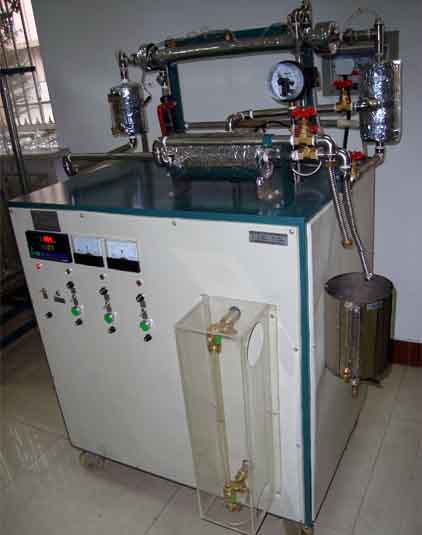 電蒸汽鍋爐、套管換熱器、蒸汽冷凝罐、蒸汽及水流量測試設備、加熱由固體調壓模塊無級調節(jié),由多路巡檢儀顯示的溫度測試系統,不銹鋼臺架及控制屏等。