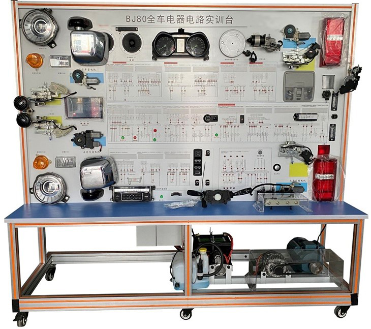 該設備采用全新BJ80 2.3T整車電器實物為基礎(chǔ),充分展示汽車發(fā)動機防盜系統(tǒng)、儀表系統(tǒng)、燈光系統(tǒng)、雨刮系統(tǒng)、喇叭系統(tǒng)、點火系統(tǒng)、電動車窗系統(tǒng)、電動門鎖、音響系統(tǒng)、起動系統(tǒng)和充電系統(tǒng)等汽車電器各系統(tǒng)的組成結(jié)構(gòu)和工作過程。