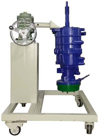 采用減速翻轉(zhuǎn)機(jī)構(gòu),可使變速器旋轉(zhuǎn)任意角度,并能任意位置鎖止,便于學(xué)生從不同的角度進(jìn)行拆卸和裝配。