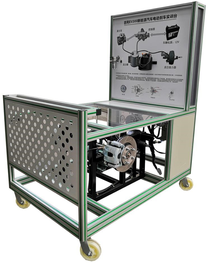 吉利EV450電動(dòng)車電動(dòng)真空泵(2件,1件解剖)、電動(dòng)真空泵控制單元、真空壓力傳感器、剎車真空助力器、剎車總泵與踏板、剎車真空罐(2件,1件解剖)、剎車油瓶、開關(guān)電源12V30A、點(diǎn)火開關(guān)、真空表、壓力表(0~100kg/psi)、左右前輪液壓剎車盤總成、左右半軸總成、電機(jī)與變頻器(220V4KW1400轉(zhuǎn)電機(jī),220V5KW變頻器)、電機(jī)傳動(dòng)帶與輪盤一體化全鋁合金型材搭建的移動(dòng)臺(tái)架(1500×1000×1700mm ,帶自鎖腳輪裝置,帶安裝檢測(cè)端子的原理面板948×898mm)、故障模擬與排除裝置、設(shè)備操作說明書。